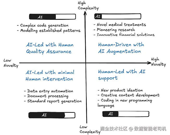 一个实用框架可以用来确定 AI 的最优参与度,它包含三个维度:问题新颖性(problem novelty) 、技术复杂度(technical complexity) 与 风险等级(risk level) 。