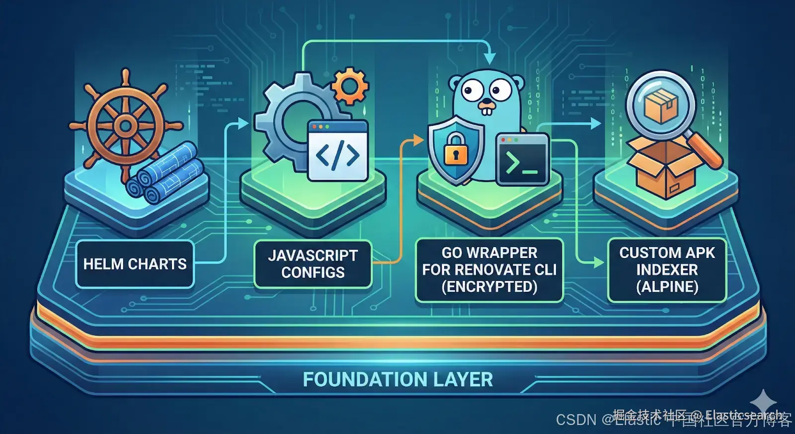 基础层包含 Helm charts、JavaScript 配置、带加密支持的 Renovate CLI Go 包装器,以及用于 Alpine 包的自定义 APK Indexer。