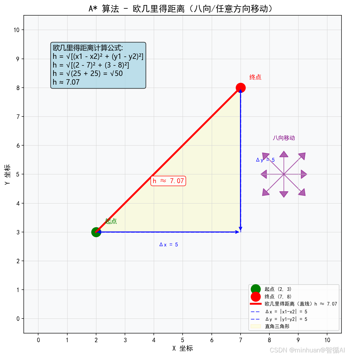 - 启发值 h = √[(2-7)² + (3-8)²] = √(25 + 25) = √50 ≈ 7.07