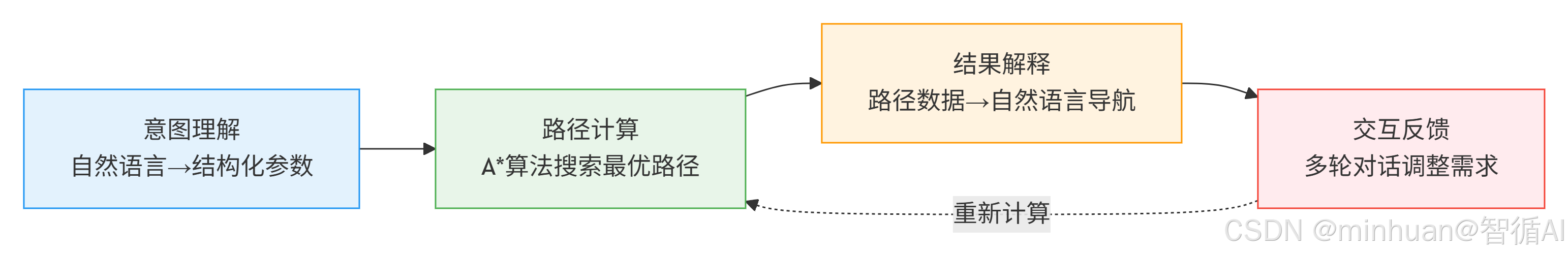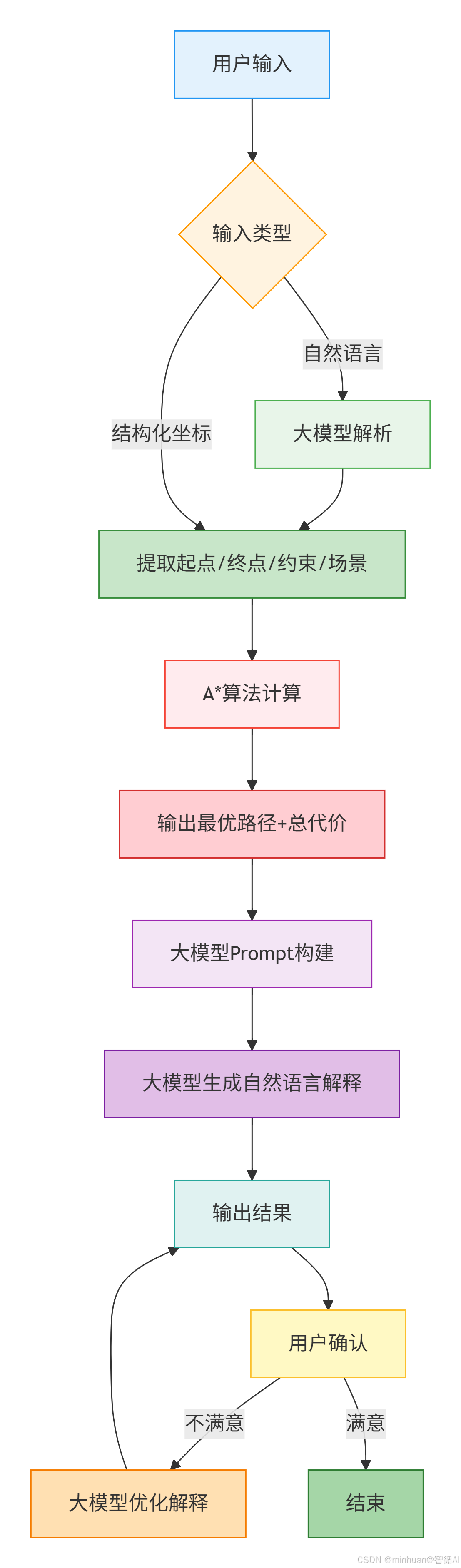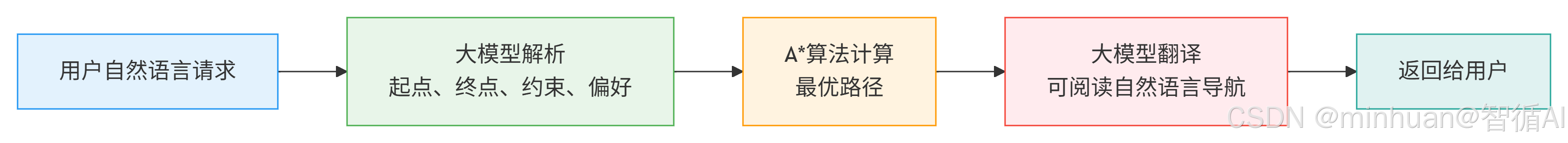 用户自然语言请求 → 大模型解析:起点、终点、约束、偏好 → A*算法计算最优路径↓大模型把路径翻译成可阅读、可执行的自然语言导航 → 返回给用户