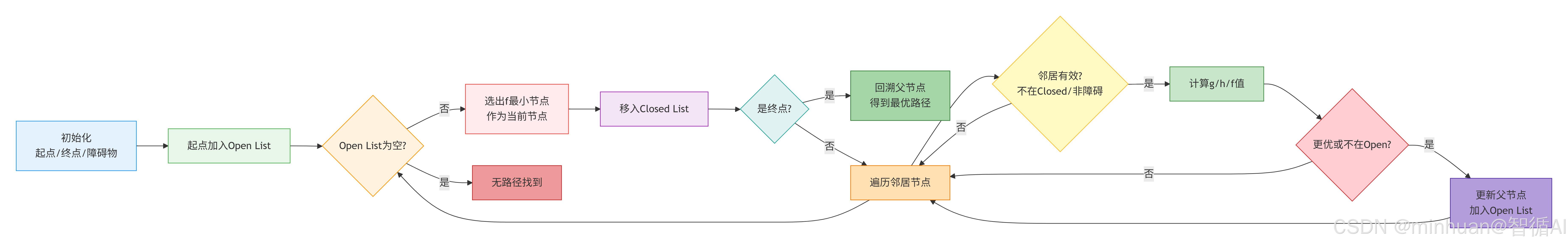 - 回溯父节点,从终点倒推回起点 → 得到最优路径