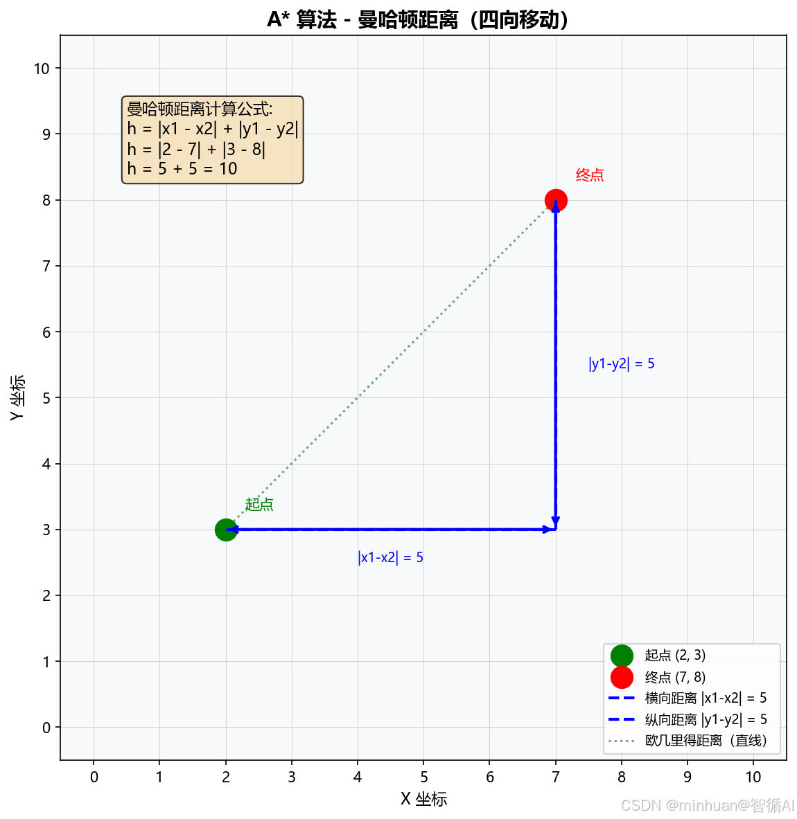- 计算公式:h = |x₁ - x₂| + |y₁ - y₂|
