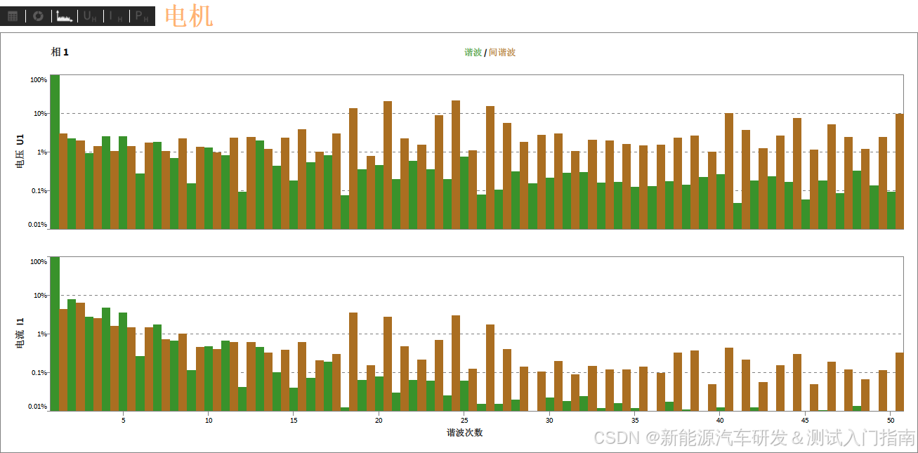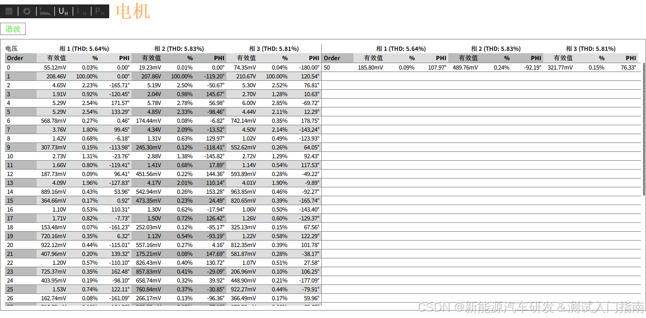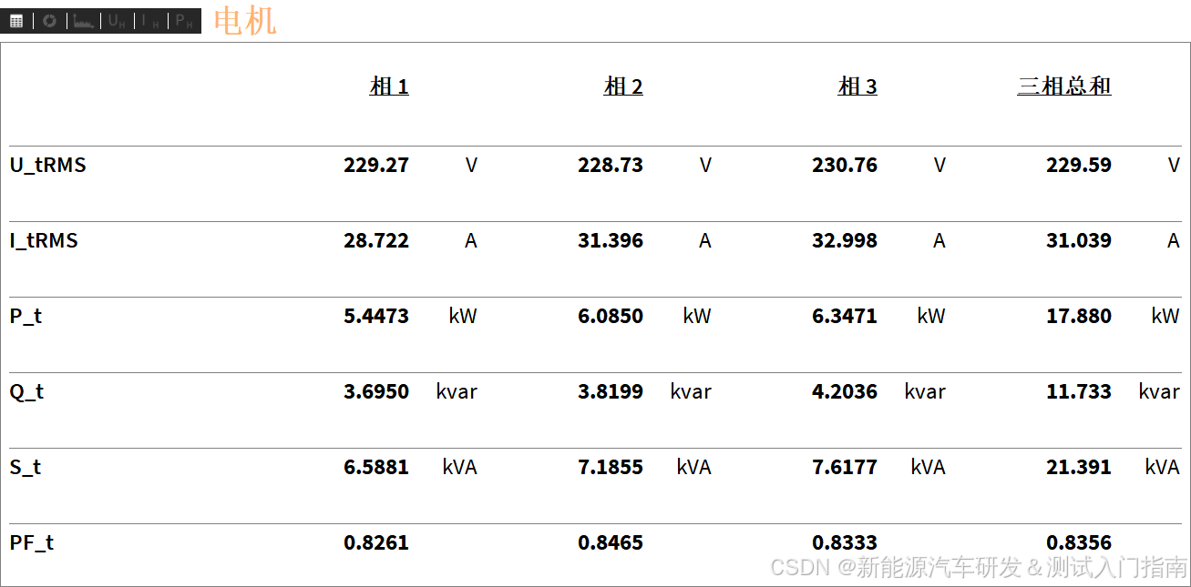 导读:本文基于新能源商用车驱动电机整车运行状态下的6组核心测试图谱,从基本电气参数、相位能量流、谐波频谱、谐波功率等维度,完成电机电气性能的标准化诊断分析,明确电能质量核心问题,同时给出针对性的故障排查与优化方案,为新能源商用车电驱系统能效提升、可靠性优化提供工程化参考。