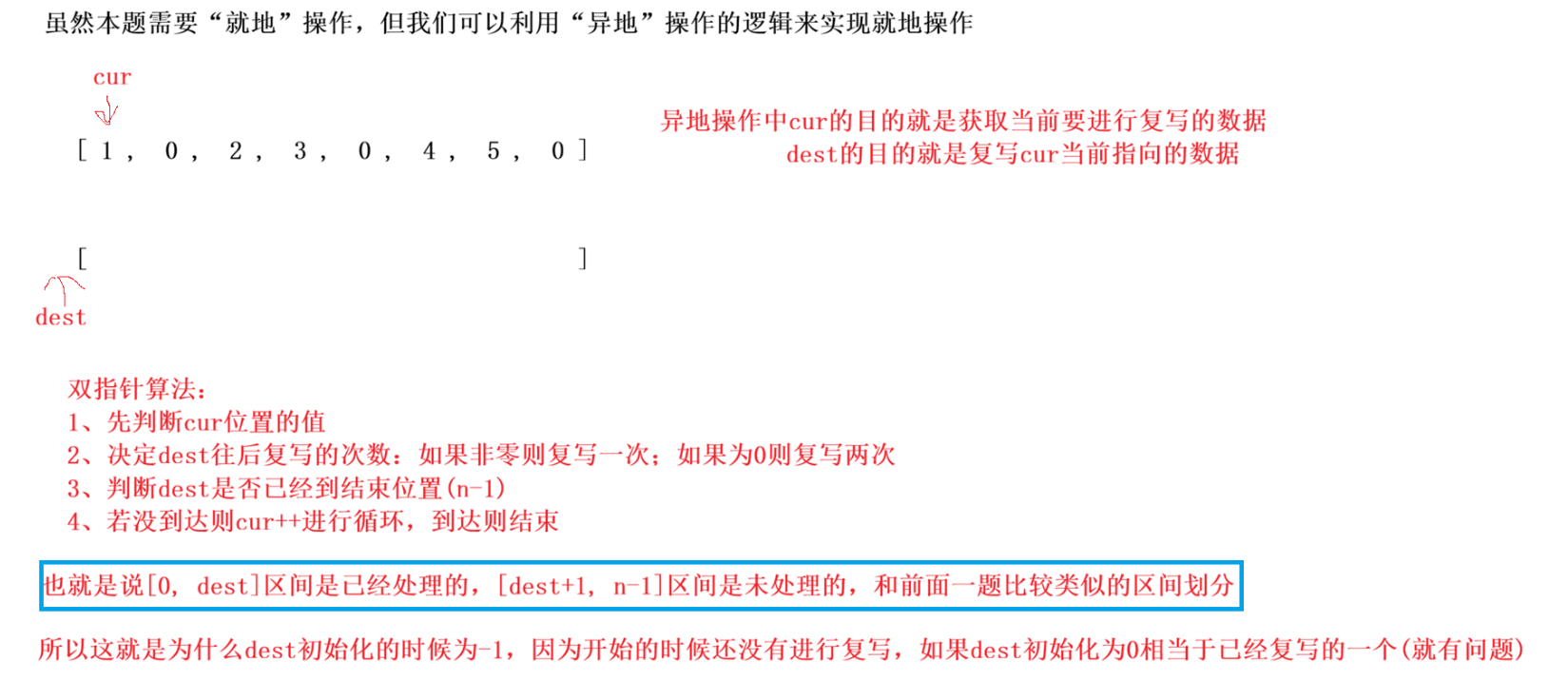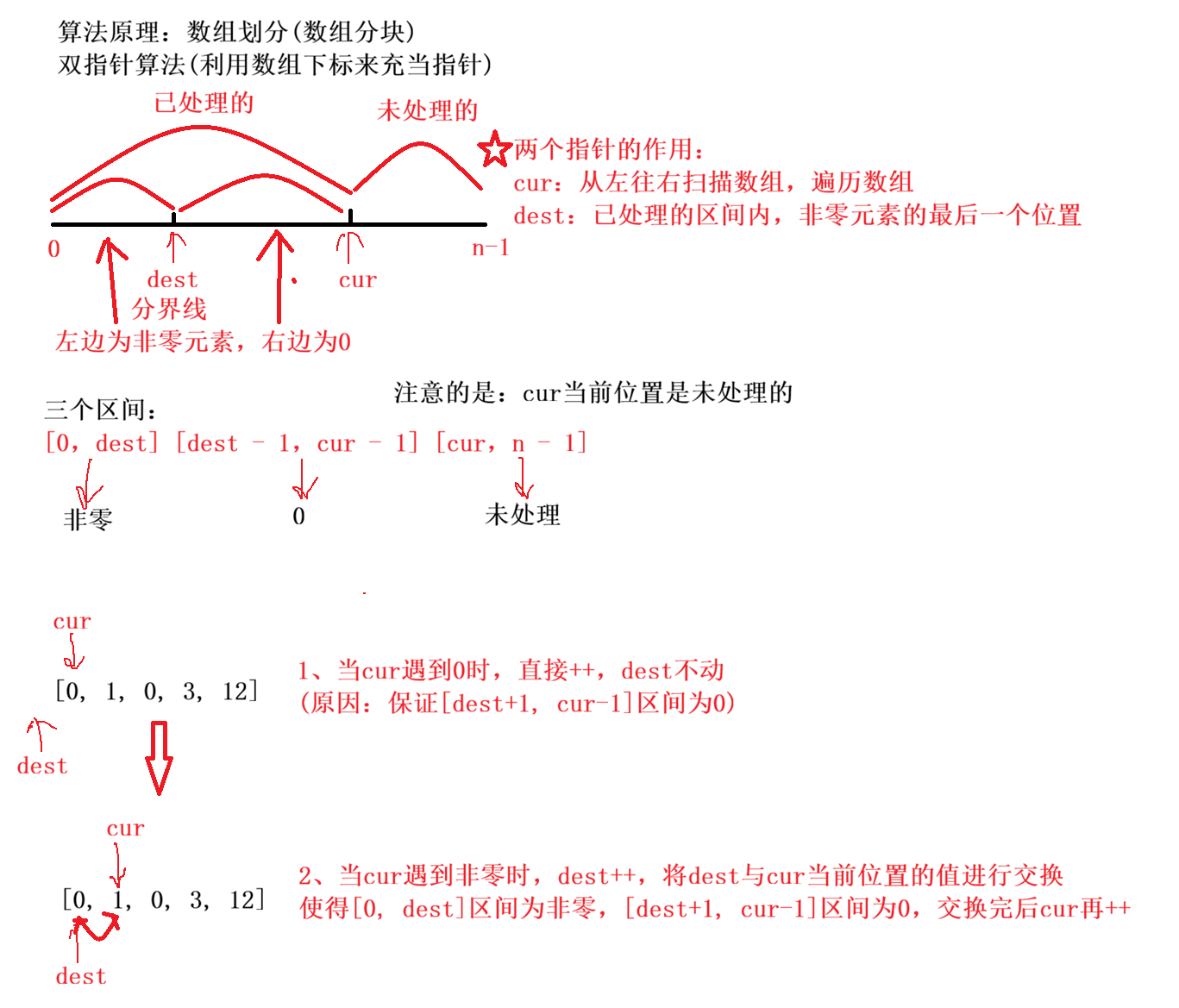 - 我们可以用一个 cur 指针来扫描整个数组,另一个 dest 指针用来记录非零序列的最后一个位置,根据 cur在扫描的过程中,遇到的不同情况,分类处理,实现数组的划分。