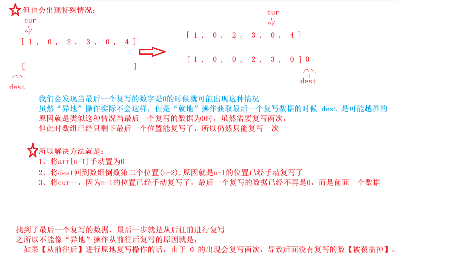 - 判断cur 位置的元素:(1)如果是0 的话,dest 往后移动两位;(2)否则,dest 往后移动一位