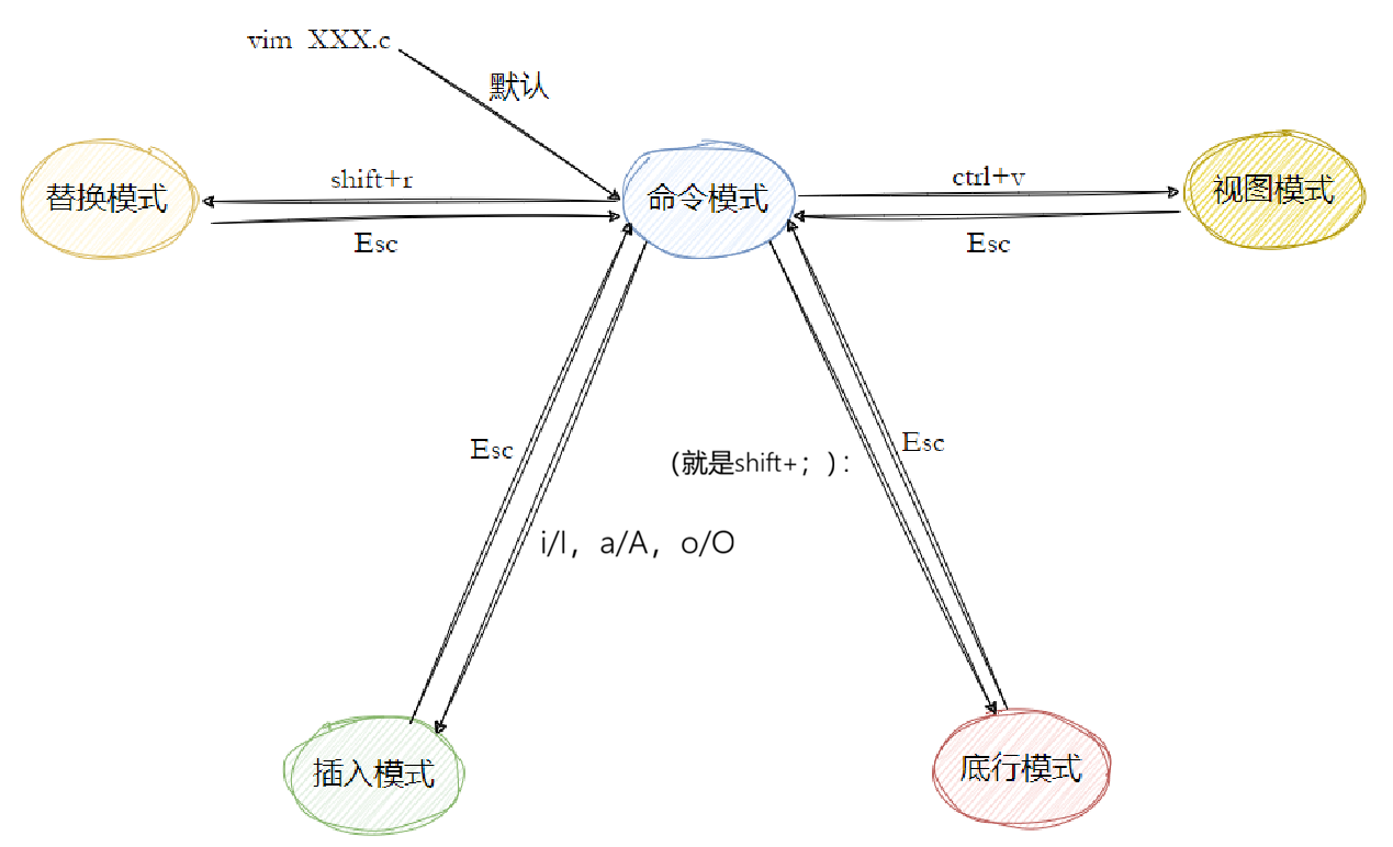 基本上 vi 共分为 3 种模式,分别是一般命令模式 、编辑模式( 包含插入模式与替换模式**)** 与命令行模式, 还有一种视图模式,在某些特定的场景下很有用