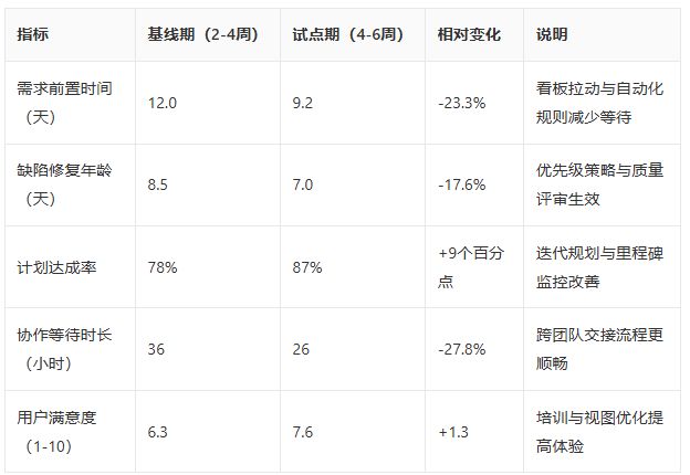 在科学方法上,应设定可证伪的假设与成功标准 。例如:在4---6周内,试点团队的需求前置时间下降≥20%,缺陷修复年龄下降≥15%,计划达成率提升≥10%,协作等待时长下降≥25%,并且用户满意度≥7/10。将这些标准写入试点章程,明确扩展门槛与退出条件。章程还应包含数据采集方法、采样频率、治理机制与风险清单,保证试点的可操作性与可审计性。