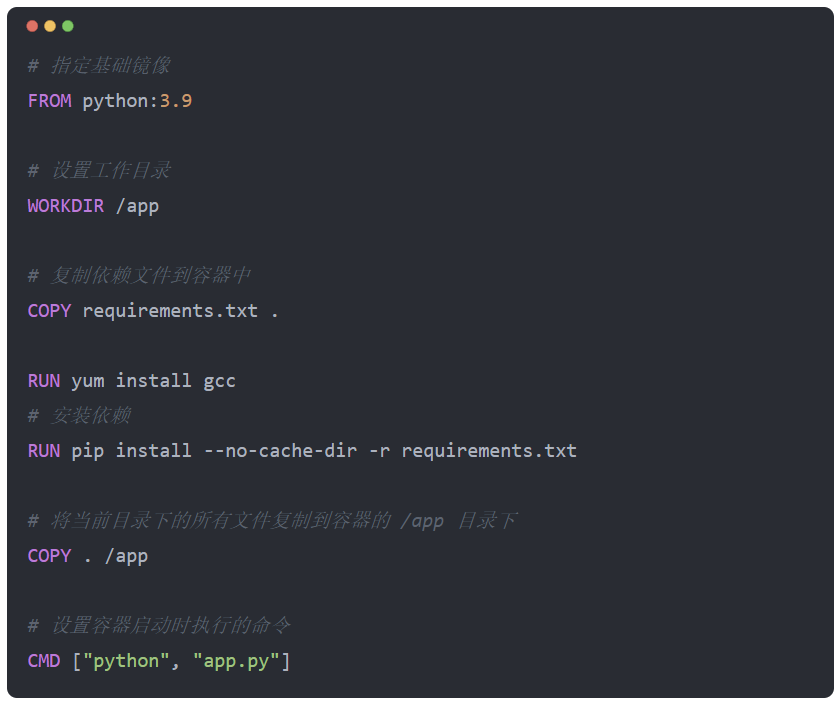 具体含义是,基于一个装了 python3.9 解释器的操作系统(基础镜像),再执行 pip install 等命令安装其他依赖,从而构建出一个适合程序运行的环境,最后用 python app.py 运行我们的目标应用程序。像这样一份列清楚了,从操作系统到应用服务启动,需要做哪些事情的清单文件(todo list),就是所谓的 Dockerfile。