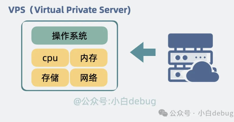 云厂商一般会将一台物理服务器分割成多个虚拟机 。它跟我们在 windows用 VMware 建的虚拟机其实是一回事。每个虚拟机都拥有独立的操作系统、资源(比如 CPU、内存、存储空间)和公网 IP 地址。然后对外出售,这样的虚拟机就是所谓的 VPS(Virtual Private Server,虚拟专用服务器)。