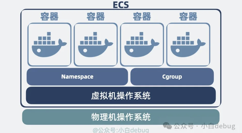 总的来说就是,物理服务器上跑 ecs,ecs 跑 Docker 容器。多个 Docker 容器共享一个 ecs 实例 操作系统内核。