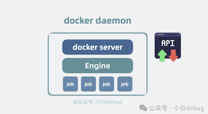 再具体点,Docker Daemon 内部分为 Docker Server、Engine 两层。Docker Server 本质上就是个 HTTP 服务,负责对外提供操作容器和镜像的 api 接口,接收到 API 请求后,会分发任务给 Engine 层,Engine 层负责创建 Job,由 Job 实际执行各种工作。