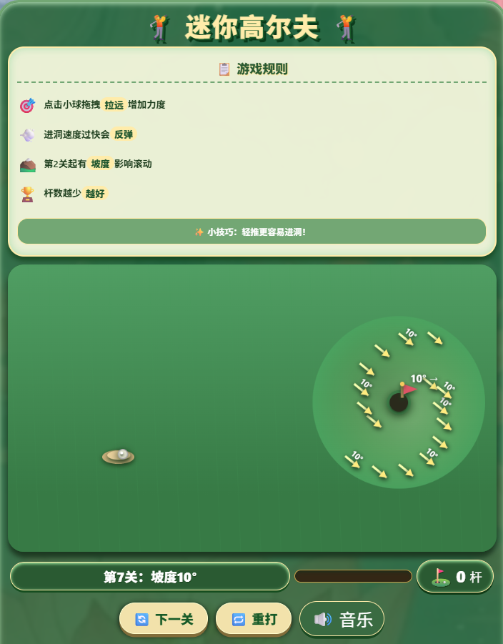 高尔夫球模拟 - 玩家通过拖拽控制击球方向和力度,球会物理滚动并受到摩擦影响