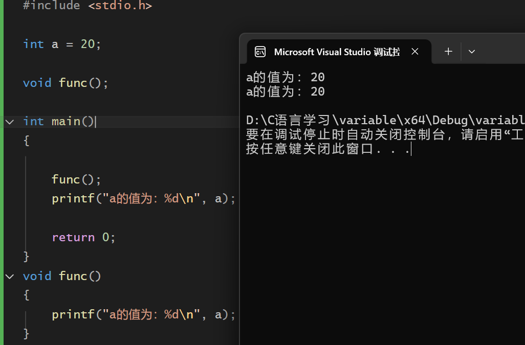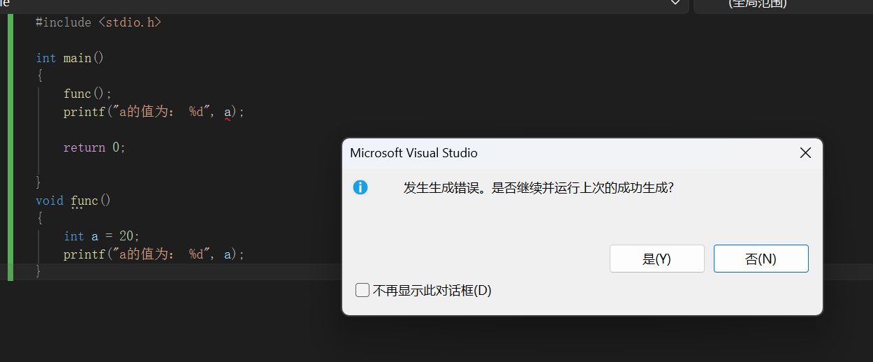 局部变量例子如下:此处的a在函数func()中定义,所以在main()函数中无法调用。