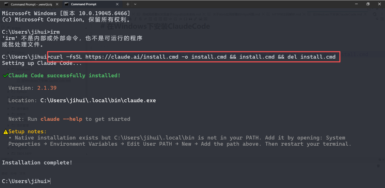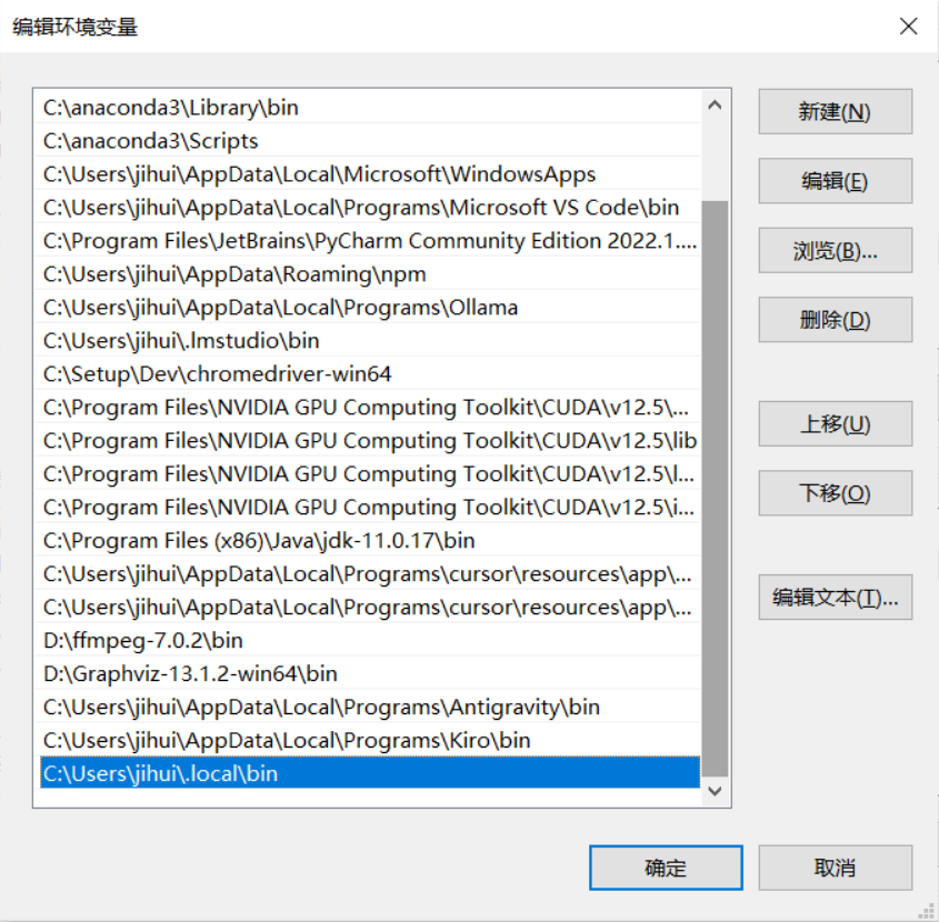 配置环境变量,在PATH中加入C:\Users\jihui\.local\bin
