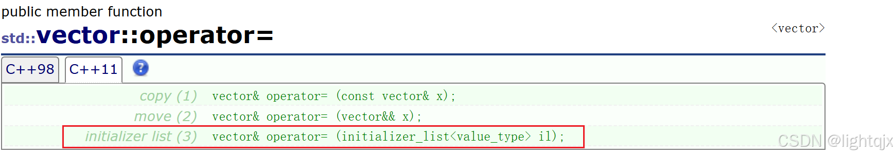 除了构造时有initializer_list的使用,operator= 也重载了initializer_list参数的使用。