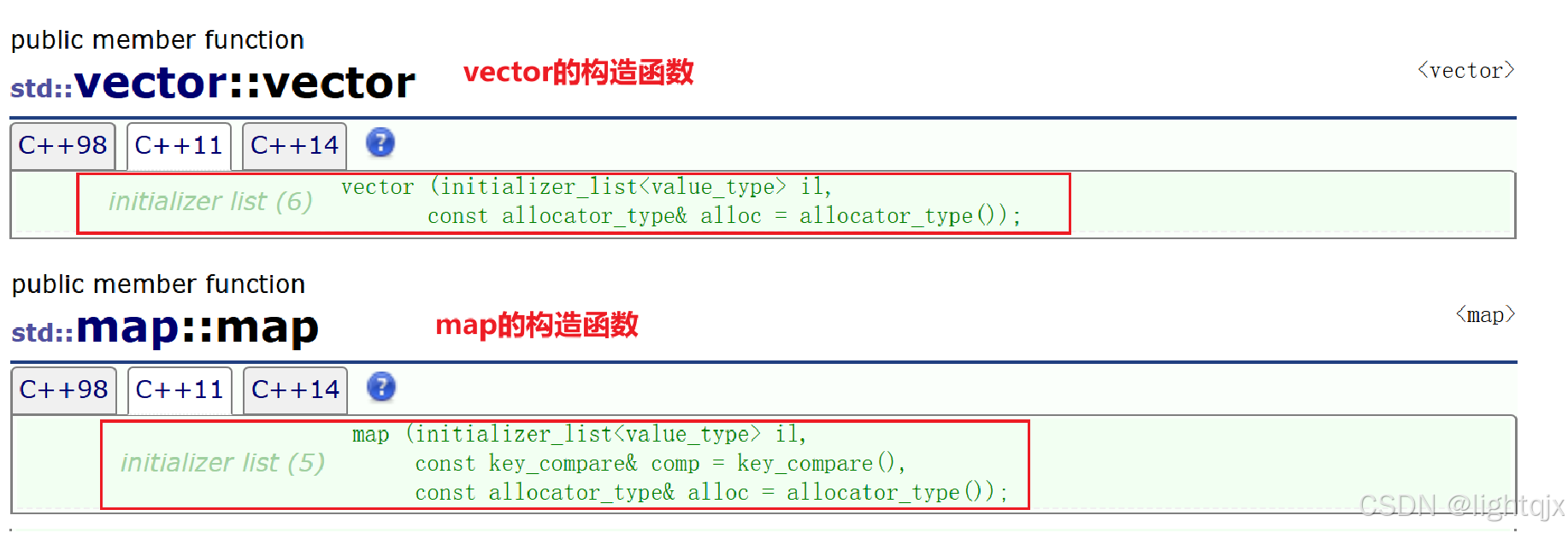 std::initializer_list一般是作为构造函数的参数,在C++11中,在STL的容器中就增加了许多这样的构造函数,如下所示,这里是vector和map中构造函数的变化。