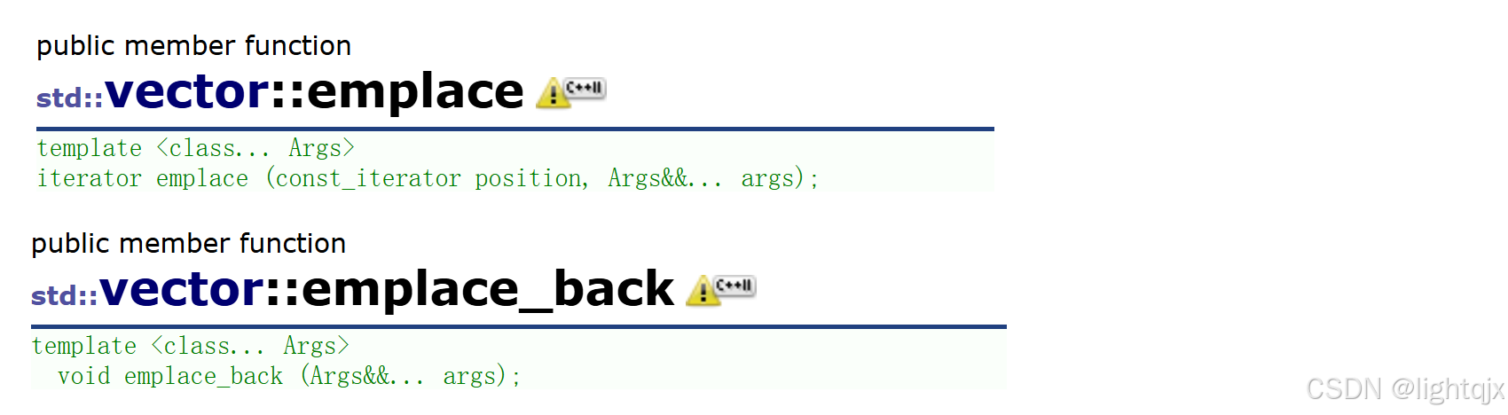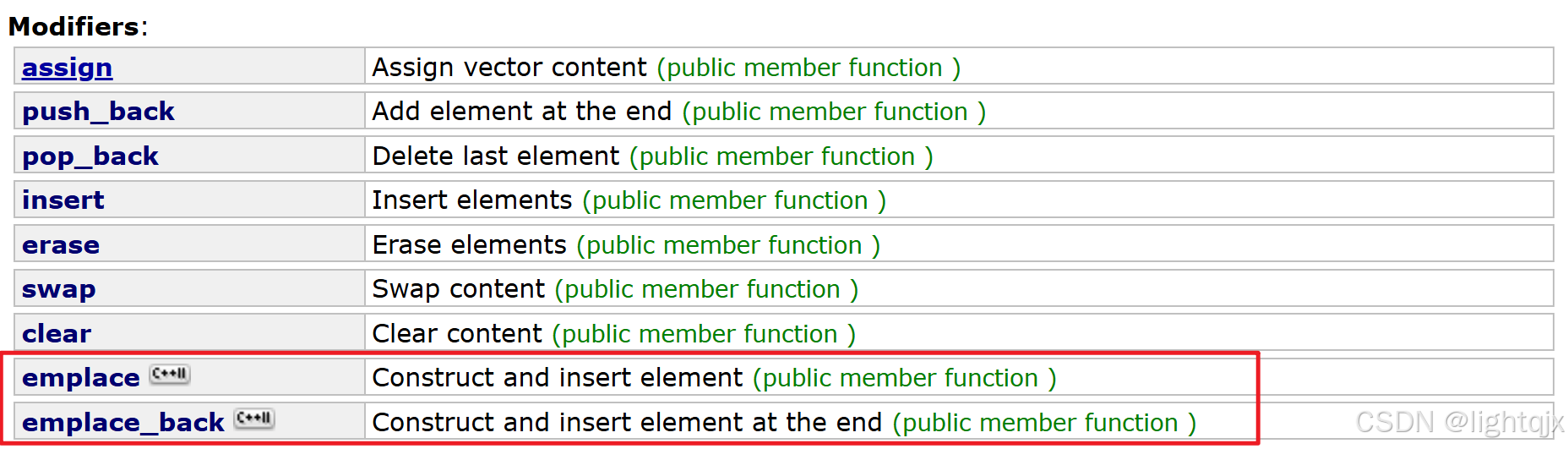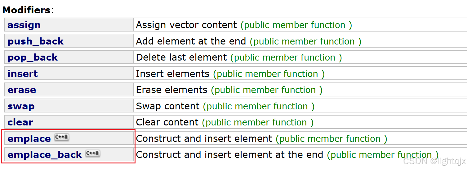 其中emplace对应insert,都是插入的意思,emplace_back对应push_back都是尾插的意思。具体的接口如下所示: