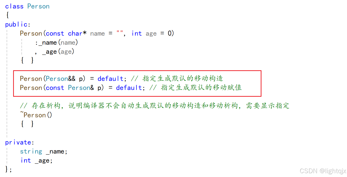 如果你自己定义了析构函数、拷贝构造函数或拷贝赋值重载中任意一个,就都不会生成移动构造和移动赋值重载了。但是我们可以通过default来显示指定编译器强制生成默认的移动构造或移动赋值重载。如: