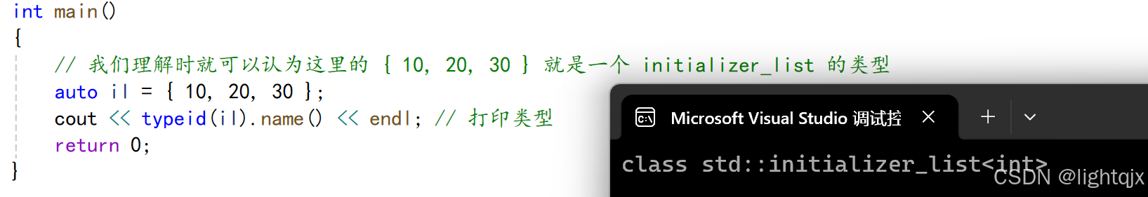 它用于表示和访问一组特定类型的常量值的数组,主要用于支持使用花括号 { } 进行的列表初始化。而我们使用 { } 初始化的时候编译器都会将这个数据列表转换成一个initializer_list,如以下代码: