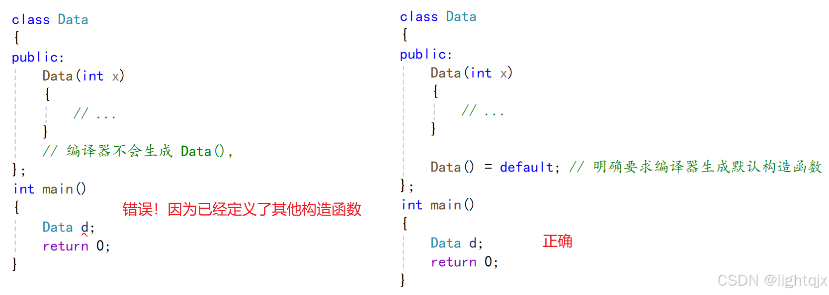 比如如果你定义了其他构造函数,编译器就不再生成默认构造函数,但是使用 default 则可以也可以让它生成默认成员函数。如: