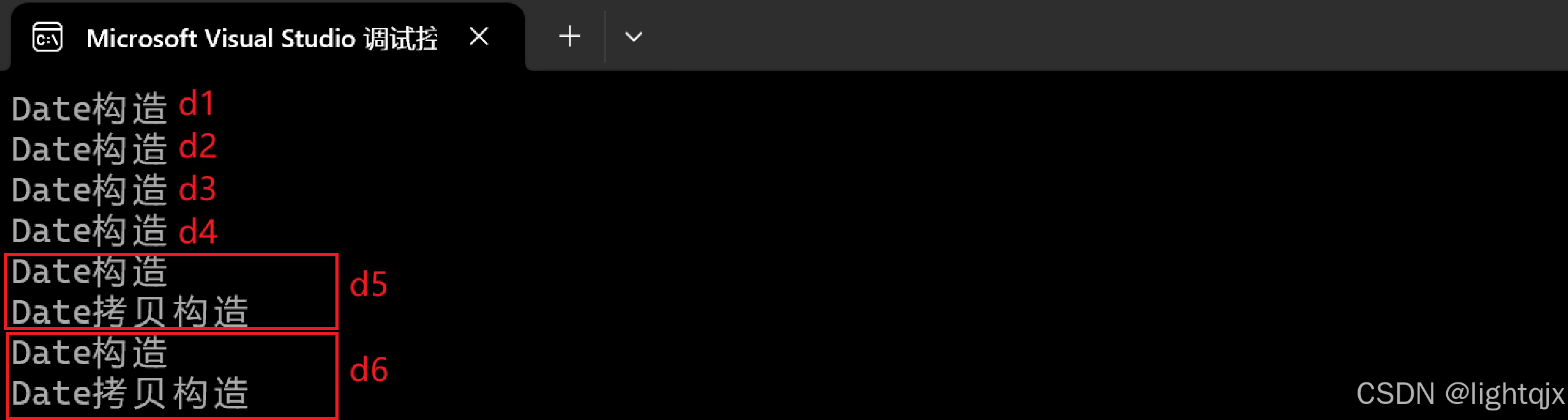 cppint main() { // 通过传递参数来构造 // 这种方法会通过参数包一直传递到Date的构造函数中从而直接使用传递的参数构造 Date* d1 = Create(); Date* d2 = Create(1); Date* d3 = Create(1, 2); Date* d4 = Create(1, 2, 3); // 先构造一个Date对象,此时参数包中就只有一个对象,这是会调用拷贝构造来创建Date对象 Date* d5 = Create(Date(1, 2)); Date* d6 = Create(Date(1, 2, 3)); return 0; }运行结果: