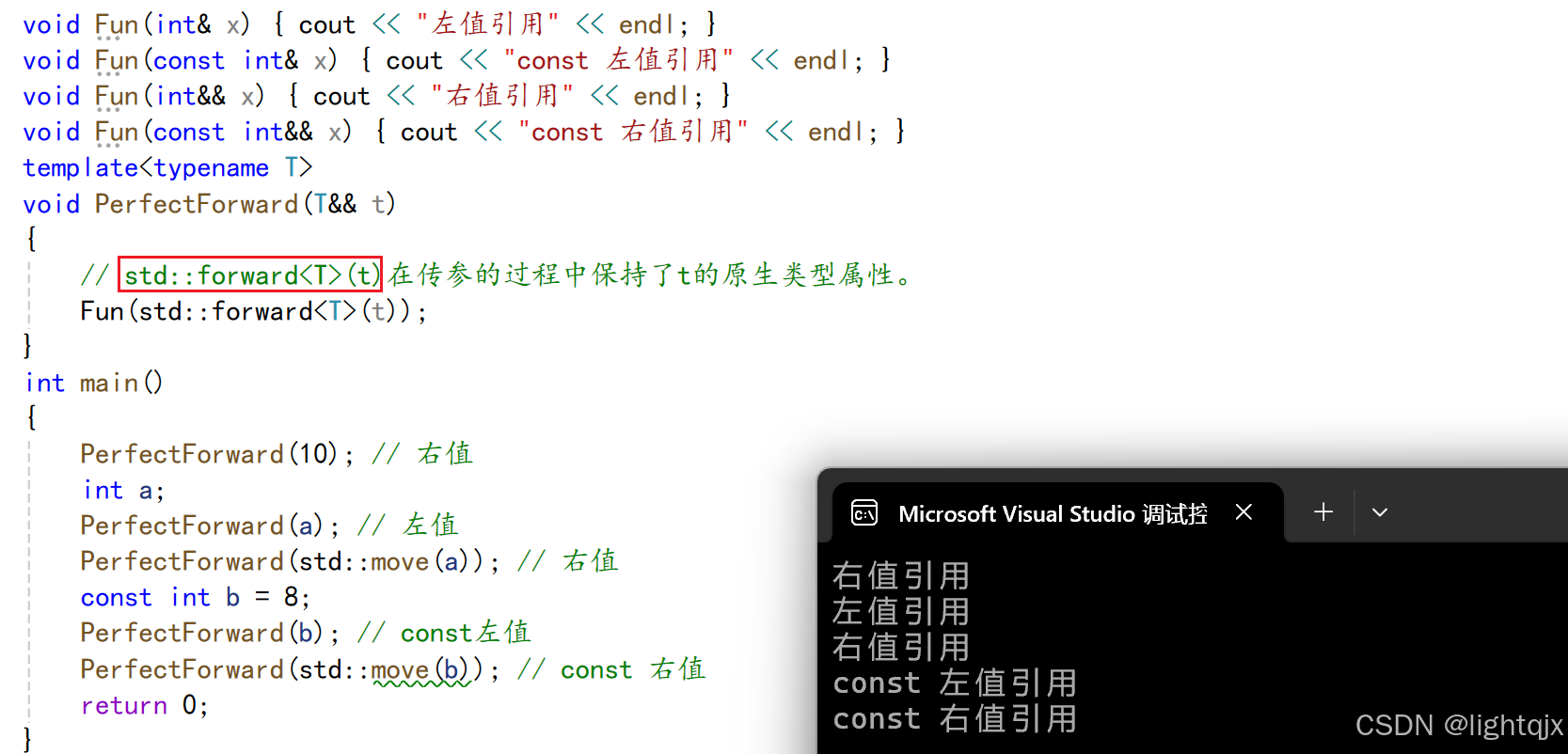 而完美转发则可以在传参的过程中保留对象原生类型属性 ,如果是左值引用那就是左值引用,如果是右值引用,那就是右值引用。它必须在模板中使用 ,即必须配合万能引用一起使用,如下所示: