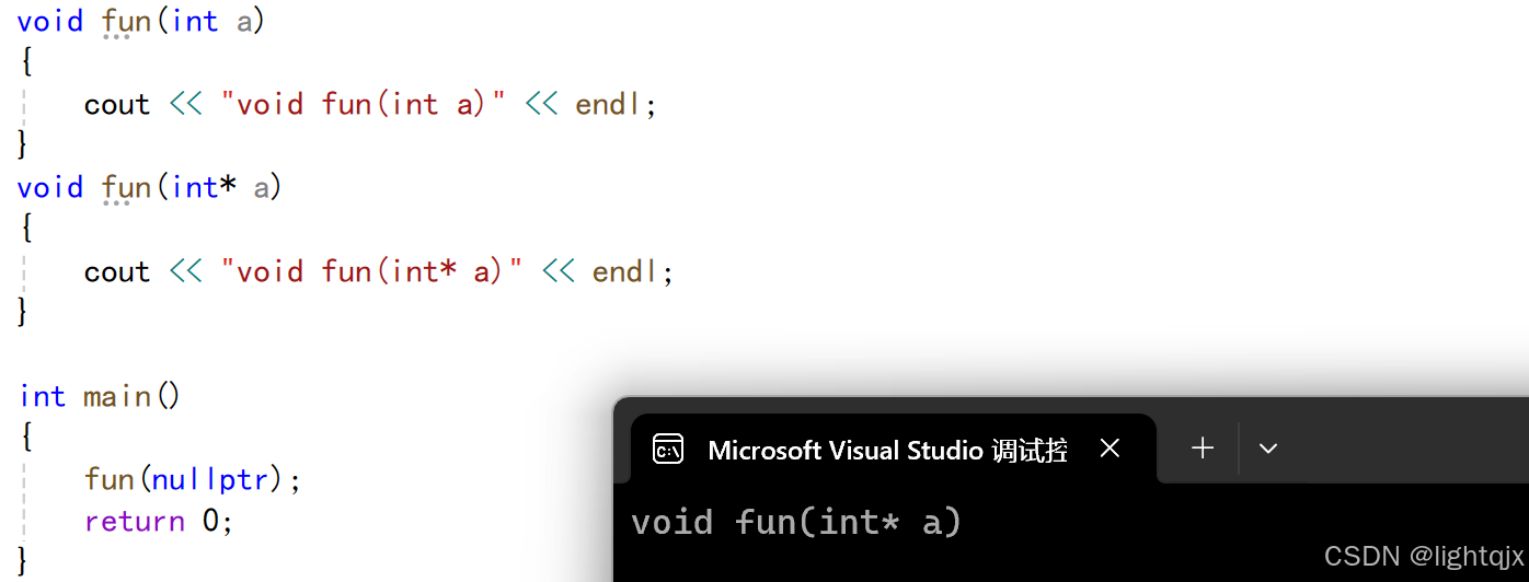 这里我们理解的NULL是空指针,则应该调用void fun(int* a),但是这里却没有调,与想调用指针版本的初衷违背。