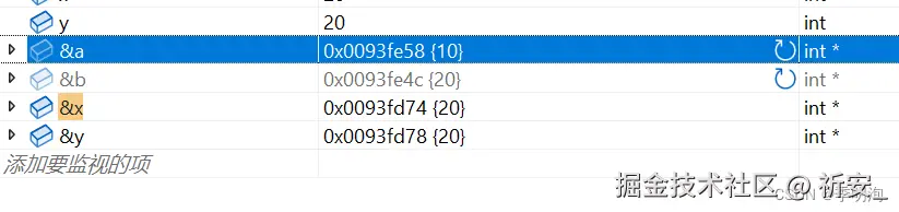 我们发现在main函数内部,创建了a和b,a的地址是0x0093fe58,b的地址是0x0093fe4c,在调用Swap函数时,将a和b传递给了Swap函数,在Swap函数内部创建了形参x和y接收a和b的值,但是x的地址是0x0093fd74,y的地址是0x0093fd78,x和y确实接收到了a和b的值,不过x的地址和a的地址不一样,y的地址和b的地址不一样,相当于x和y是独立的空间,那么在Swap函数内部交换x和y的值,自然不会影响a和b,当Swap函数调用结束后回到main函数,a和b的没法交换。Swap函数在使用的时候,是把变量本身直接传递给了函数,这种调用函数的方式我们之前在函数的时候就知道了,这种叫传值调用。
