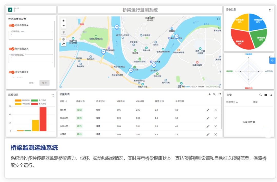 | 分级预警与养护 | 按桥梁等级(一级 / 二级)配置预警阈值,一级桥梁位移超 5mm 立即触发紧急预警,联动养护单位 4 小时内现场复核;二级桥梁预警后 12 小时内处置,实现 "重点优先" 的养护策略; |