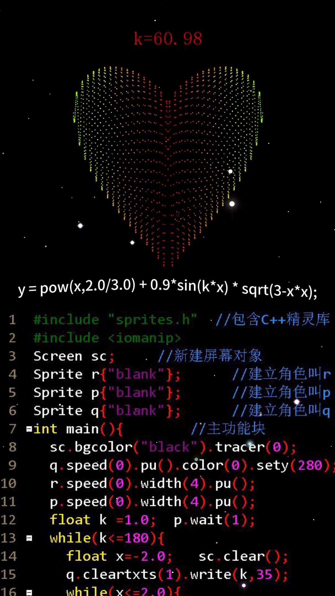 这是一段用代码写就的数学情诗,一场由粒子与音符交织的视觉告白。当《梦中的婚礼》的旋律缓缓流淌,屏幕上的彩虹色粒子便开始了一场浪漫的舞蹈------它们从混沌中诞生,随着参数 k 的微小跃迁,逐渐汇聚、凝聚,最终勾勒出一颗完美跳动的爱心。这不是简单的图形绘制,而是程序员独有的浪漫语法:用 C++ 精灵库将冰冷的数学公式 y = x^(2/3) + 0.9*sin(k*x) * sqrt(3-x*x) 解译为流动的色彩与形状,让心形曲线在参数迭代中从模糊到清晰,仿佛爱情本身从朦胧心动的瞬间,走向坚定不移的誓言。