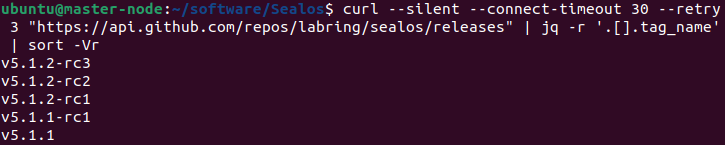 curl --silent --connect-timeout 30 --retry 3 "https://api.github.com/repos/labring/sealos/releases" | jq -r '.[].tag_name' | sort -Vr