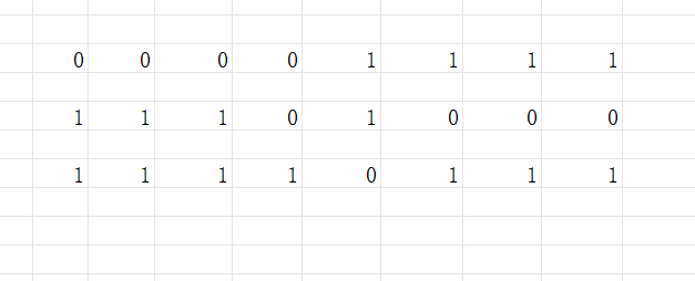 那么如果V=(Xs&Ys&(~Zs))||((~Xs)&&(~Ys)&&Zs)(~表示取非,电脑不太好写那个)这个公式就代表如果是001的组合,那||后面就代表1最后得V为1,如果是110就代表||前面那个为1最后得V为1,除去这两种情况V就等于0。