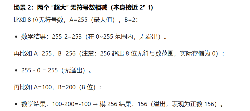 两个特别大的正数(比如本来就是溢出的两个数相减)相减或者无符号整数相减