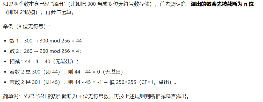 总结原理,如果是正数的情况,因为符号位都是0,所以如果溢出,即最高位产生进位,那么一定会是进0,那这个时候就看次高位,如果得到的是0说明没有溢出,如果是1说明符号位从0变为了1,即两个正数相加得到了1,故溢出。负数相加同理。