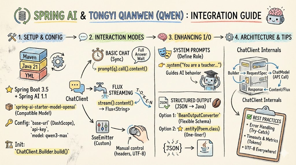 我们以真实的课程项目为例,展示如何从项目构建、基础对话、流式输出、系统提示词,到结构化输出的完整开发流程。无论你是初学者还是有一定经验的 Java 开发者,都能从本文获得实用的开发经验。