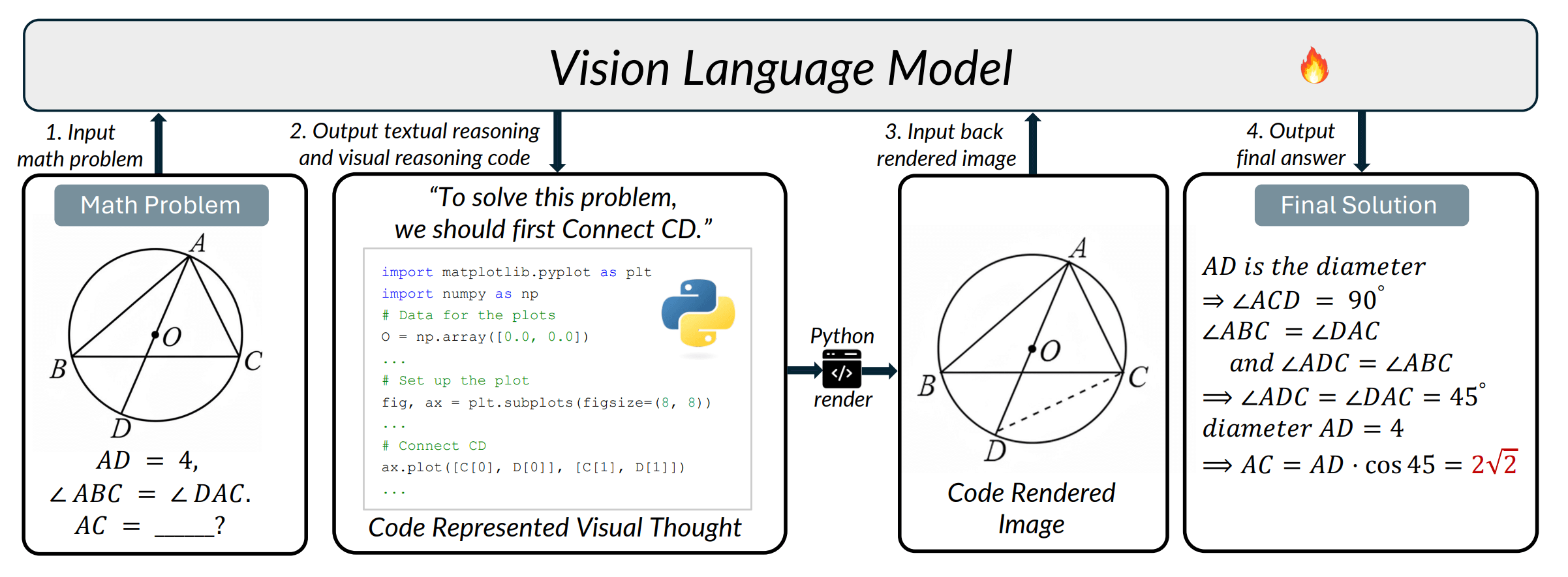 模型不再"脑补"辅助线,而是写 python matplotlib,把辅助线真的画出来,再继续解题。