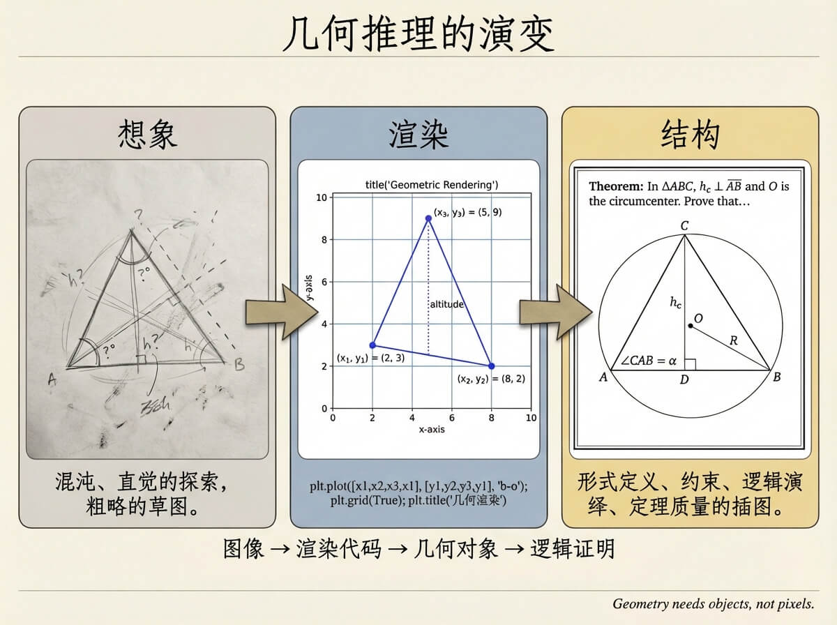 图像 → 渲染代码 → 几何对象 → 逻辑证明
