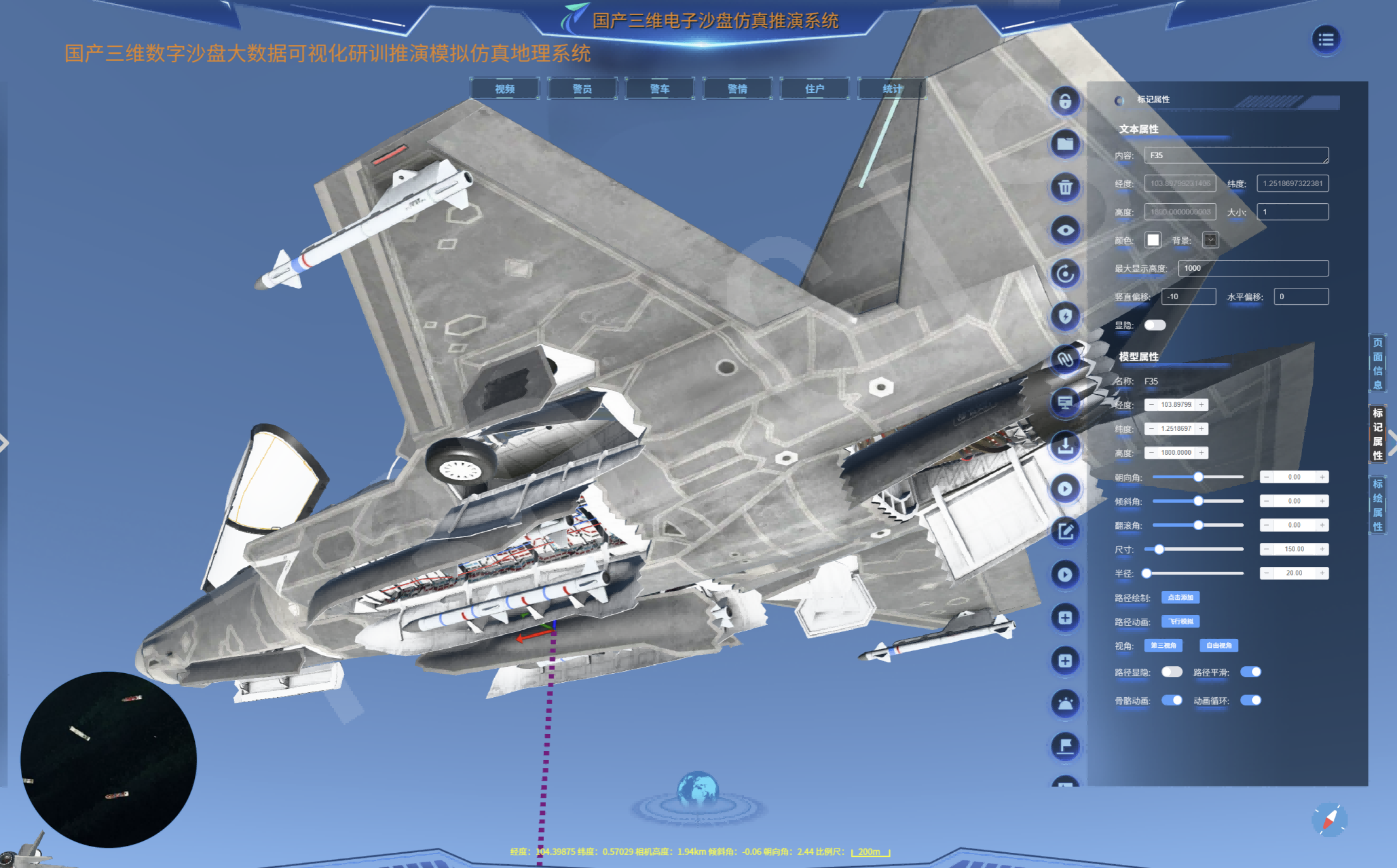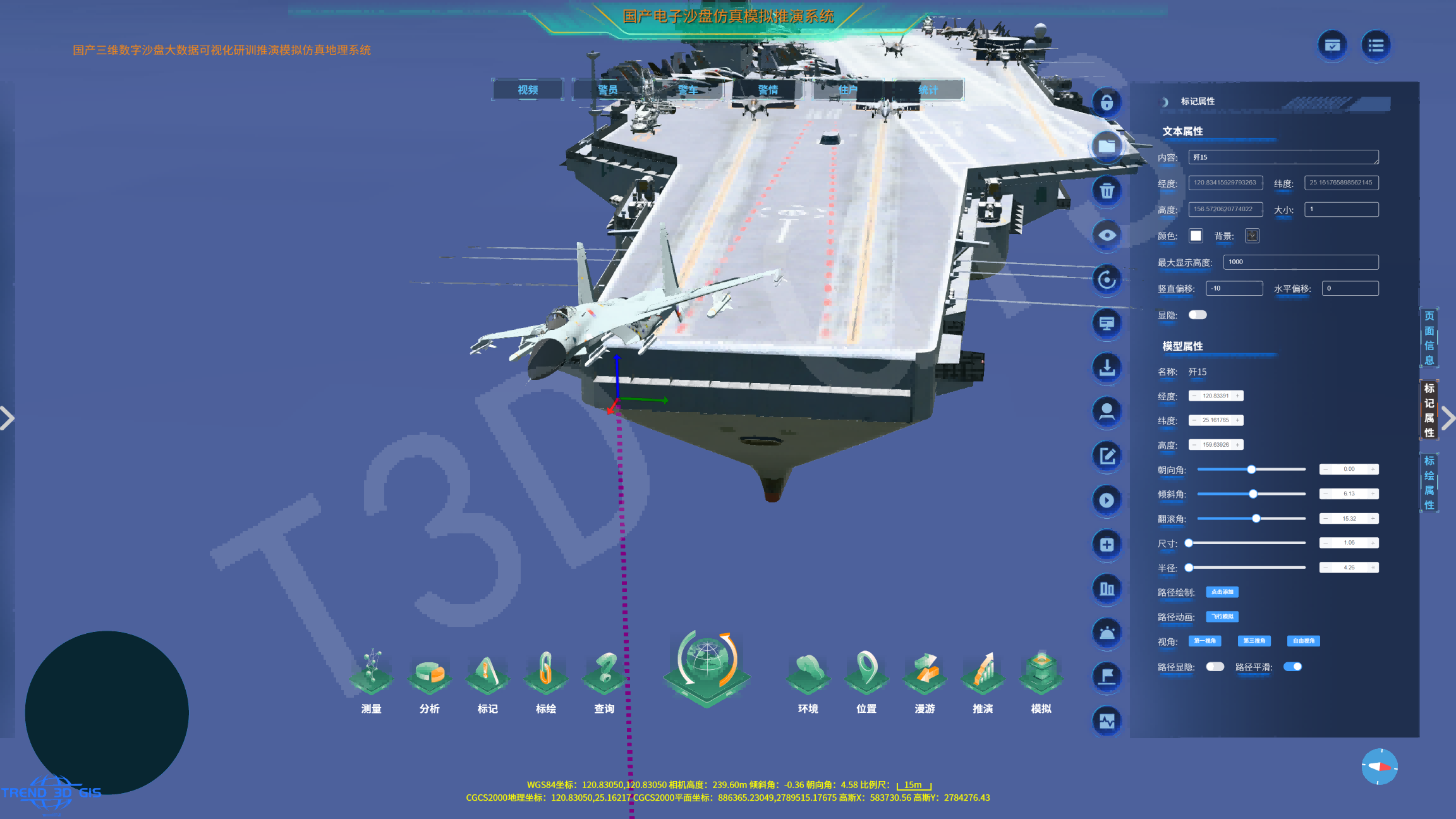 ****三维电子沙盘模型全参数化精准调控数字沙盘系统:****支持对三维模型进行多维度精准调控,包括空间位置(X/Y/Z轴平移)、尺寸缩放、采用欧拉角的四元数交互模式进行旋转角度(偏航/俯仰/横滚)、倾斜度及镜像变换等操作。具备自适应高程贴合功能,可动态匹配地形,同时提供三轴独立参数调整;具备全参数化调整、地形自适应、三轴独立控制、标准化格式兼容