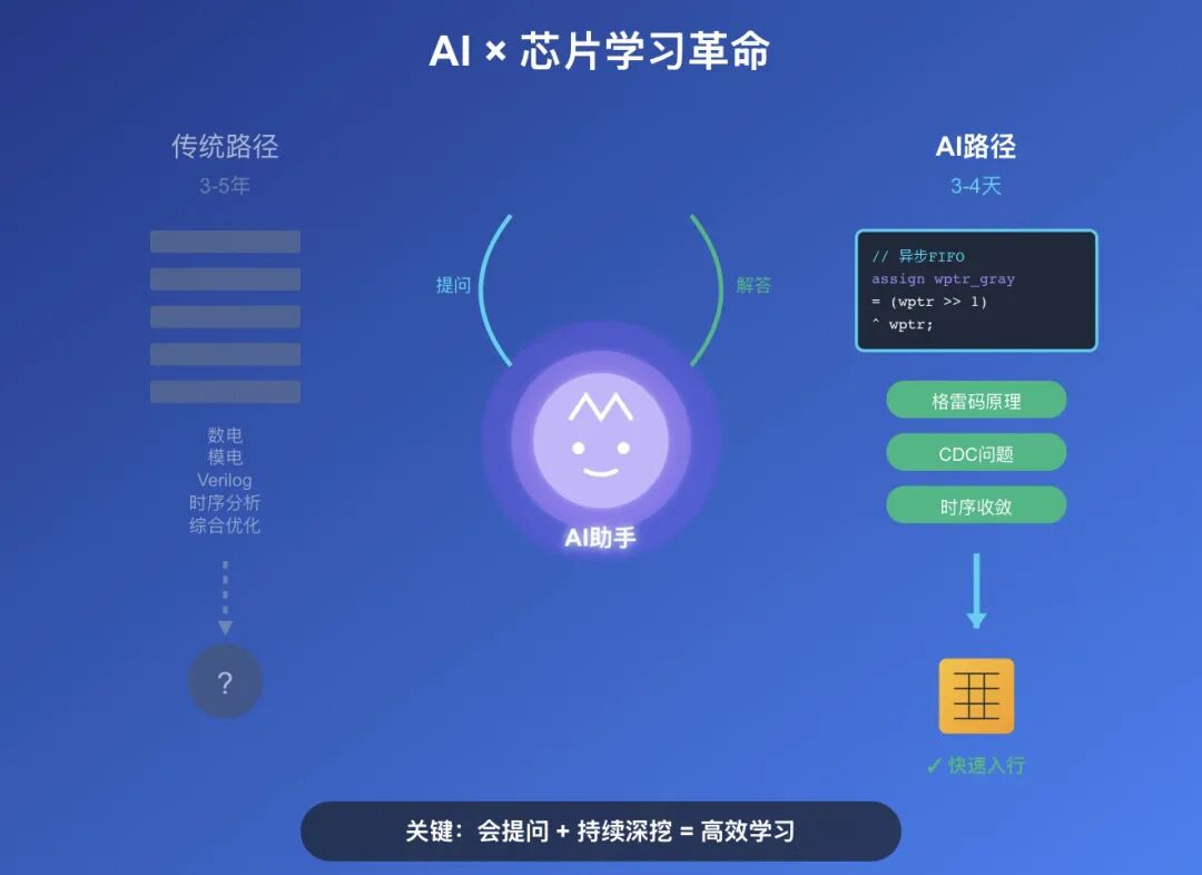 过去想入行数字芯片研发,大家都说得先啃完厚厚的教材,从数电模电学起,再到Verilog语法、时序分析、综合优化,每一块都是硬骨头。很多人光是搞懂Setup Time和Hold Time的关系就要花好几周。