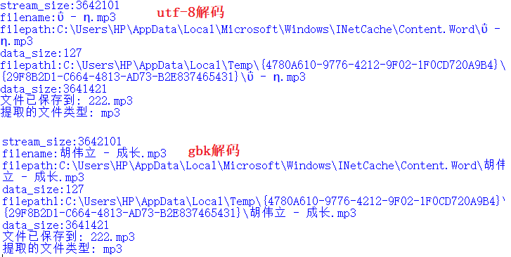 经过多次验证,如果ole文件中的原始文件名称是中文,采用gbk编码可以正常解码,运行效果如下所示: