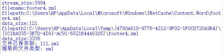 下面的示例代码及运行结果用于从\x01Ole10Native流中提取文件名称、原始数据等信息。