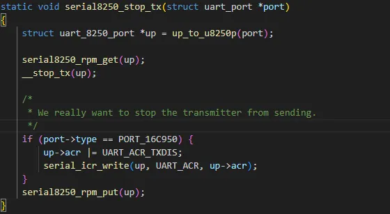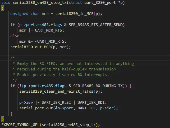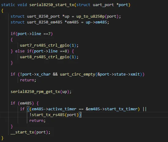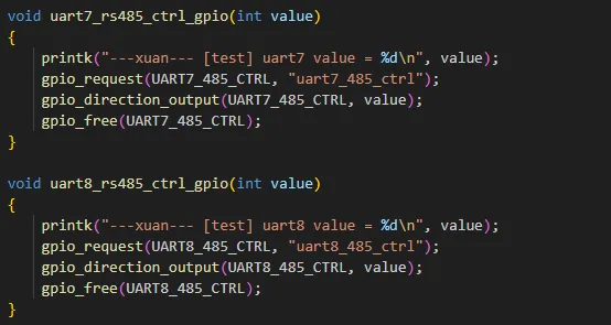 RS485的发送接收模式的切换,已经集成进内核驱动程序,无需用户手动控制GPIO切换,部分关于RS485模式自动切换的内核驱动程序代码如下: