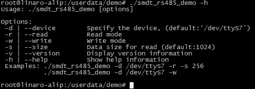 查询确认文件修改权限成功后,执行 ./smdt_rs485_rw -h 可以查看该程序的帮助信息 本测试脚本中部分设置的默认参数如下: device: /dev/ttyS7 即 UART4 size:1024 即 在读模式下接收数据的默认长度为1024