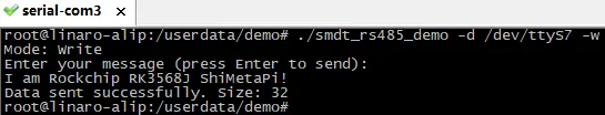 执行 ./smdt_rs485_rw -d /dev/ttyS7 -w,将会进入发送输入状态,遇到回车键发送数据,执行结果如下: