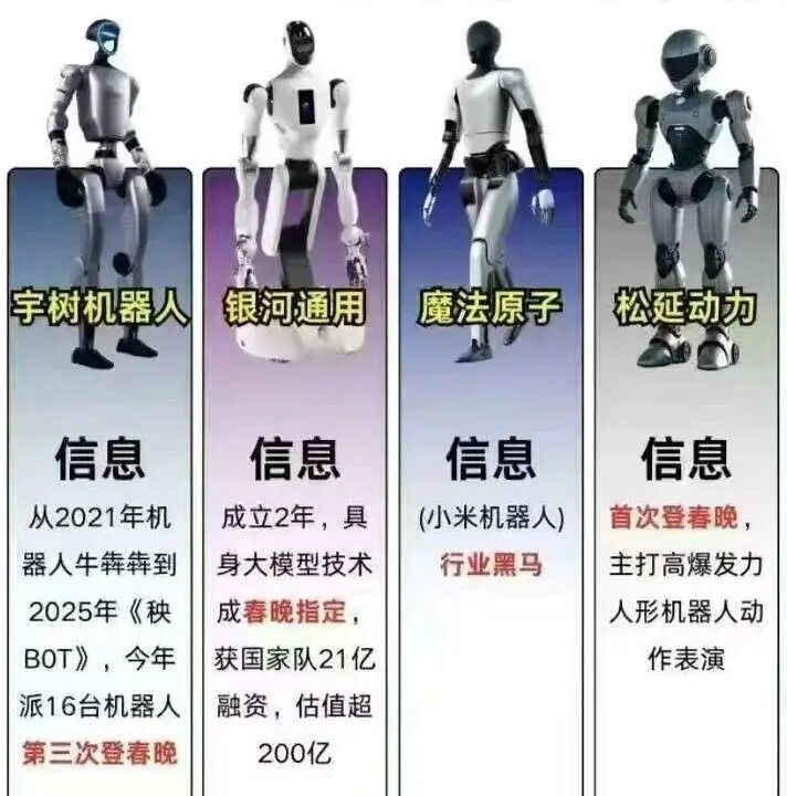 上春晚的几家单位也代表了国内目前机器人企业发展的方向,包括本体技术、大模型技术等,应用场景也有所不同。