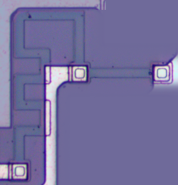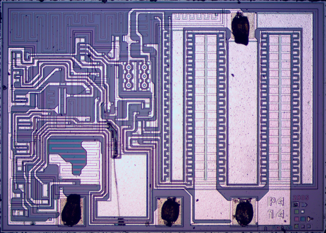 在硅片表面上,一层薄金属连接着芯片的不同部分。这种金属在模具照片中清晰可见,呈现白色痕迹和区域。[5] 一层薄的玻璃状二氧化硅层在金属与硅之间提供绝缘,除非二氧化硅中的矩形接触孔允许金属与硅连接。芯片边缘有细线连接金属焊盘和芯片外部引脚------照片中的黑色斑点显示了线连接的位置。