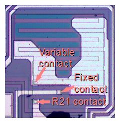 分压器(蓝色)将输出引脚的电压缩放下来,以便带宽参考使用。 它有一个有趣的实现,允许78XX系列的不同芯片产生不同的电压。(例如7812的12伏和7824的24伏。) 下图显示了金属(白色)与电阻(绿松石色)之间的方形触点,控制R20和R21的数值。 对于不同的稳压器,简单改变可变触点位置即可增加R20的电阻,从而提高芯片的输出电压。