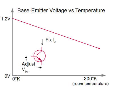要制造随温度下降的电压,你通过晶体管施加恒定电流,观察基极和发射极之间的电压,称为VBE。下图显示了随着温度升高,电压如何下降。左侧线路接触硅的带隙电压,约1.2伏;这点以后会很重要。