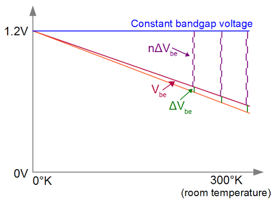 带隙参考中的电压:两个晶体管随温度变化而为Vbe。