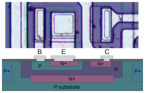 照片下方有一张横截面图,展示了晶体管的大致结构。书中看到的N-P-N夹层远不止如此,如果你仔细观察"E"下方的垂直截面,你会发现构成晶体管的N-P-N。发射极(E)线连接到N+硅。再下面是连接基极接触(B)的P层。再往下是N+层,间接连接到集电极(C)。[7] 晶体管被一个P+环包围,将其与邻近元件隔离开来。